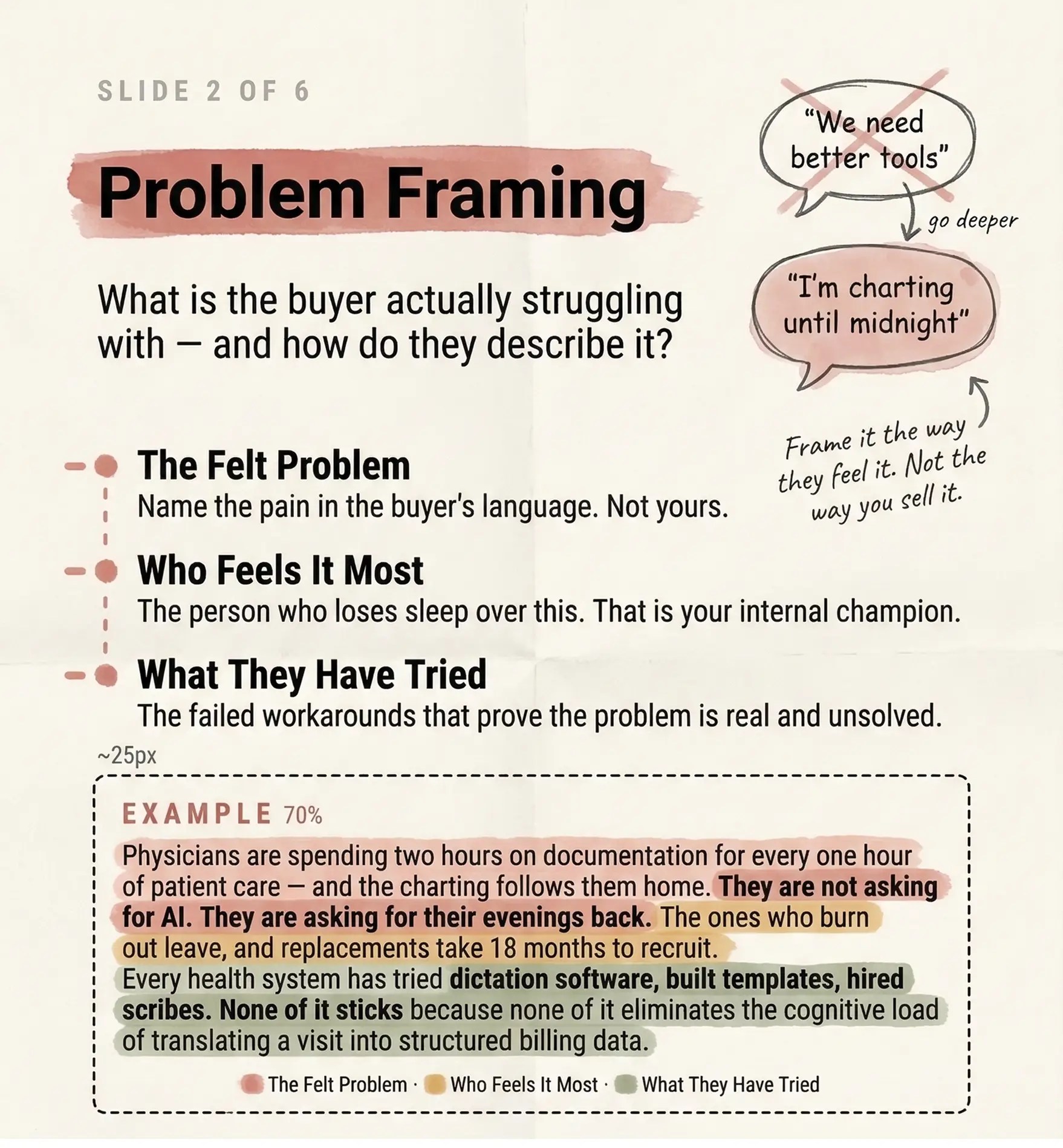 I work with B2B healthcare SaaS companies, AI-powered platforms, clinical workflow tools, value-based care, behavioral health, practice management. The positioning mechanics are the same: complex buyers, long sales cycles, multiple stakeholders, and the constant risk of getting lumped into a category you don’t belong in.